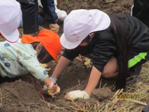 10月31日に、サツマイモ掘り集会が行われました。高学年の子供たちが、低学年や保育園児と関わる姿を見ていて感じたことは、やはり毎年くり返し下の年齢の子供たちといろんなかたちで関わっていくことで、子どもたちの思いやりの心、相手意識が育っていくのだろうと思いました。また、言葉の理解が難しい年下の子に対して、年上の子は考えを巡らせながら相手に気持ちを伝えようとする姿も見られました。このように異年交流はさまざまな場面で多くの能力が育まれ、生きる力を培うことにもつながっていくのではないでしょうか。