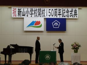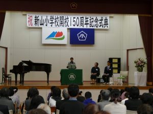 10月25日に、開校150周年記念式典が行われました。3年間かけて準備してきた、実行委員の皆さん、本当にありがとうごいました。何度も会合を開き、いろいろ議論しながら取り組まれてきたことが、本番でりっぱな式典につながったことと思います。当日は、厳粛な雰囲気の中で行われました。意見発表では、伊東佳保里さん、上村健一さん、児童会長の守屋結生さんが発表してくださいました。児童会長の結生さんが落ち着いて新山への思いを語ってくれました。また、その後会場からも、子どもたちや地域の人達が、それぞれの思いを伝えてくれました。今回の意見発表のように地域の人と一緒に自分達の「ふるさと」について語り合うことが大切なことだと思いました。今後、子ども達が、地域のために何ができるのか考えてみることにもつながっていって欲しいなあと感じました。