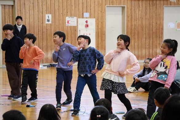 3年生は6年生のかっこいいところ、すごいところ、ありがとうのメッセージを、かっこいいポーズと共によびかけました。なわとびやブリッジ、筋トレなども披露しながら、全校の笑いを誘う素敵な発表でした。