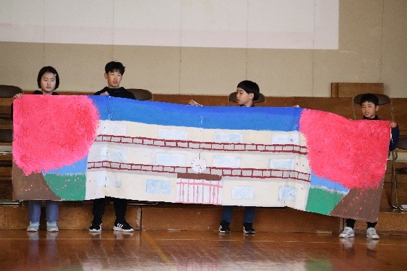 最後に、6年生からはクイズを2種類。小さい頃の写真を見せて誰か当ててもらうクイズと、どの学年にあてたありがとうの言葉かを当ててもらうクイズでした。小さい頃の写真を見て、全校のみんなが「〇〇さんだ!」と、すぐに当ててしまうほど、仲のいい手良小学校です。そして、卒業記念品の絵を披露。布に描かれた手良小学校の校舎と満開の桜の絵は、卒業式や入学式に、体育館に飾ります。