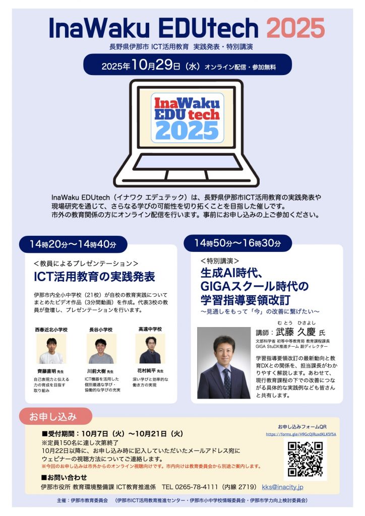伊那市の先生たちが日々の実践を持ち寄り、未来の学びを語り合う場「InaWaku EDUtech 2025」が、2025年10月29日(水)に開催されました。