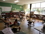 2年生が教室一杯に貼り合わせた模造紙を拡げて何かしようとしていました。「子どもたちは,地球を描こうとしています。そこに,家を並べて世界にして,蚊帳(かや)のような網をかけて教室の中で『ウズラ』と一緒に生活したいと願っているんです。」と先生が教えてくれました。土砂降りの中でもウズラ小屋に様子を見に行く2年生。ウズラは,2年生にとって教室で一緒に生活する仲間なんですね。