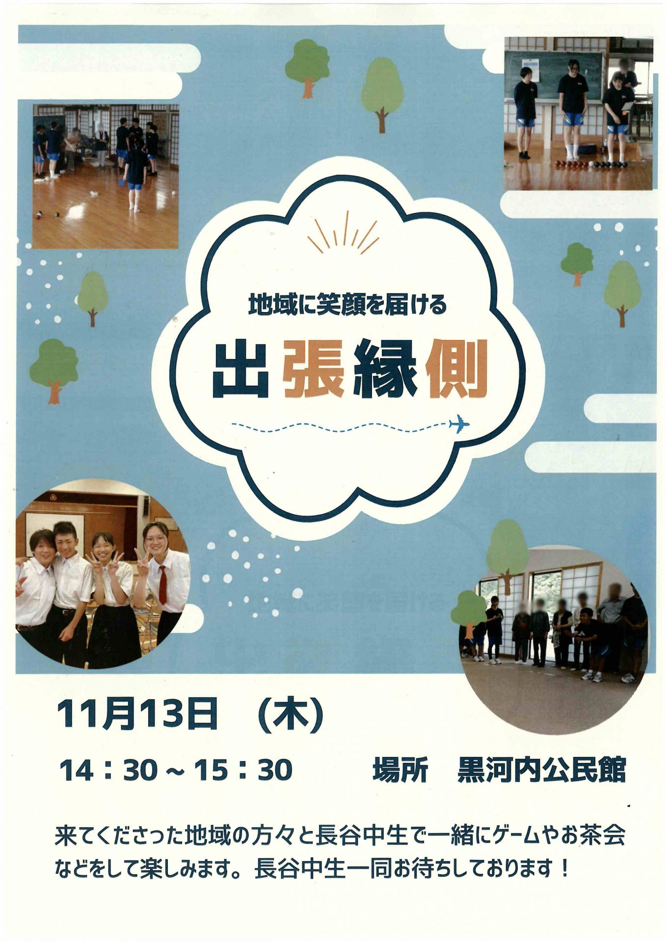 学校生活ブログ 出張「長谷の縁側」 開催します!! 2025年11月10日 長谷の縁側 11月13日(木)に、出張「長谷の縁側」を開催します。今回は溝口地区(溝口溝友館)と非持地区(非持聚楽館)、そして黒河内地区(黒河内公民館)の3会場です。 (チラシは黒河内地区のものです)全会場分はこちらから出張縁側チラシ.pdf 多くの方と交流できるのを楽しみにしています。ぜひお気軽にご参加ください。 前の記事 記事一覧へ 次の記事