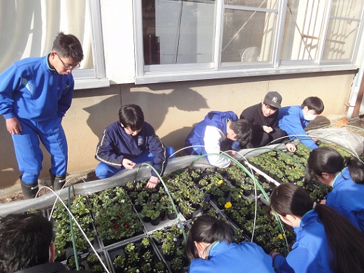 2月2日・3日、パンジーの花摘みをしました。9月に種をまき、10月にポットに上げ、大切に育てています。種ができる前にこまめに花を摘むことで、株の体力を保ち長くたくさん咲かせます。卒業式や入学式でも活躍してもらいたいと思います。
