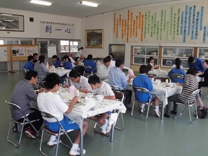 生徒集会で、生徒会企画の種目をチームごとに決めています。「ぐるぐるバット!!」「キャタビラレース」・・・・・・どれがいいかなあ。