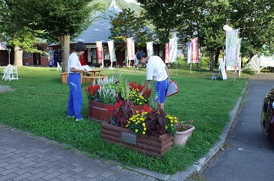 南アルプスむら 道の駅で審査する造園委員会の生徒