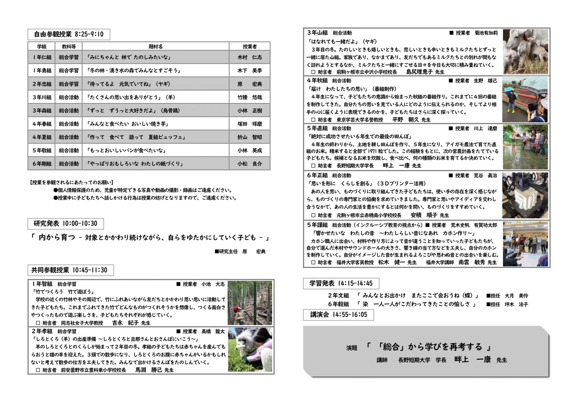 特色ある学校づくりや総合的な学び、探究活動、子ども中心の授業、インクルーシブ教育などについて、本校の実践から皆様と考える機会にしたいと思います。当日は自由参観授業や共同参観授業、学年別研究協議、学習発表、講演会(畔上一康先生)を行います。授業公開は低学年が総合学習、高学年は総合活動が中心です。