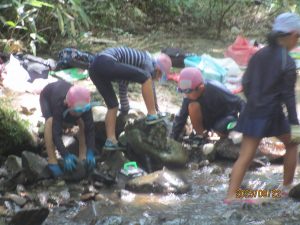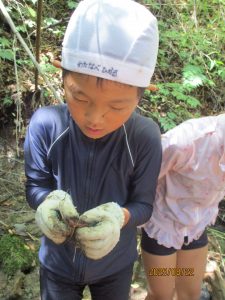 8月22日(金)に、1.2年生が新山川に川遊びに行きました。川の水は冷たくて気持ちよかったです。子ども達は、サワガニがいそうな場所を夢中になって探したり、「冷たくて気持ちいい。」と言いながら、川の中で泳いだり、顔を川の中に入れてみたりするなどして、川そのものを体全体で楽しんでいました。また、きれいな石を見つけたり、魚がいないかさがしたりするなど、いろいろな遊びに興じる姿も見られました。さらに、2年生の子が、自分がとったカニを1年生にあげている場面も見られ、活動を通して子ども達の中に相手を思いやる気持ちが養われていく姿に感心しました。