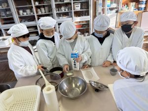 チーズ作りをしました 3年生が、総合のピザ作りに取り組んでいます。いよいよ段階的試行が始まりました。チーズの作り方を各々調べ、「お酢」と「レモン果汁」を使ってカッテージチーズ作りに取り組みました。子どもたちの考える姿は、とてもいきいきとして、悩んでいるけれど、とても楽しそうでした。それぞれのグループで無事に分量を量り、チーズを作ることができました。味や食感のちがいもあり、面白い結果が得られました。たった2時間ですが、この時間で子どもたちは様々な力を働かせて友だちと関わり、楽しく学ぶことができたと思います。 -