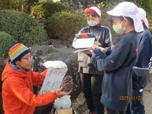 11月27日、6年生が総合学習で校庭周辺の樹木について学びたいということで、樹木医さんに来ていただきました。樹木医さんから、校庭周辺の樹木について丁寧に教えていただきました。今後、校庭周辺の樹木に名前の書いたプレートを付ける予定です。