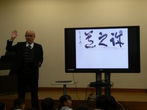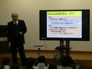 1月8日、3学期に終業式が行われました。校長先生が体育館の壁に掲げられている「誠の道」という言葉の意味についてお話をされました。「誠」は、「正直な心」「やくそくを守る気持ち」のこと、「真」は、「うそのない真実」「ごまかしのきかないほんもの」のこと。つまり、「まことの道を学ぶ」とは、「うそのない」道を学ぶということです。校長先生から教えてもらった「誠の道」の意味を心に留めて生活しましょう。