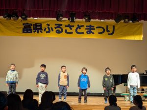 12月7日、「富県ふるさとまつり」に、1年生が参加して来ました。合唱「とびたとうすてきな仲間と」「トンボの楽園」を発表してきました。当日は、大勢の人達を目の前にして、緊張感でいっぱいだったと思います。それでも、子ども達は、最後まで自信をもって歌い、聴きに来た人達の心に響く歌声になりました。今度は、保育園で発表する予定です。次の発表も楽しみですね。