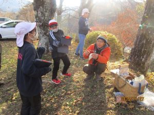 11月27日、6年生が総合学習で校庭周辺の樹木について学びたいということで、樹木医さんに来ていただきました。樹木医さんから、校庭周辺の樹木について丁寧に教えていただきました。今後、校庭周辺の樹木に名前の書いたプレートを付ける予定です。
