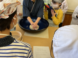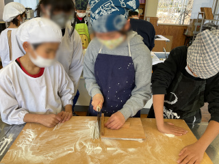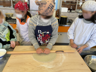 水加減やこね方がポイントだと気づいた6年生。動画を撮影したり、質問したりしながらコツをつかもうとしていました。打ち上がったそばの味は格別。「辛味大根や焼きみそ、ネギ等の薬味も高遠そばの大事なポイントだ!」と新たな気づきもあったようです。