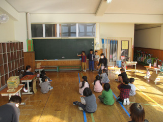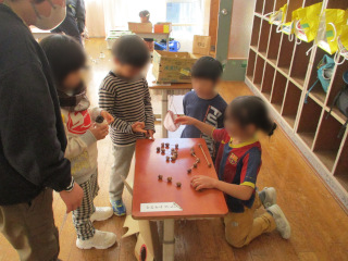 11月14日、1年生と高遠第2第3保育園年長児さんとの交流を行いました。今回は年長児さんを小学校に招き、1年生がもてなします。年長児4名を13名の1年生が迎えました。この日のために用意した手作りおもちゃを並べ、各自のブースへ呼び込みます。年長児さんも1年生もしっかり楽しんだ交流になりました。