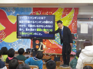 校長は、 児童に質問を交えながら「ファーストペンギン」の話を行いました。「ファーストペンギン」とは、集団で行動するペンギンの群れの中から、天敵がいるかもしれない海へ魚を求めて最初に飛びこむ1羽のペンギンのことです。最初に行動するという行為には、もちろん心配なこともあるけれど、逆によいこともある。誰かが助けを求めていたら最初に動き出す、ごみが落ちていたら最初に拾う…みなさんも「ファーストペンギン」のように「最初の一人」になってみるのもよいのでは?と語りかけました。