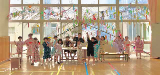 7月7日、1・2年生が七夕集会を行いました。当日までに、自分たちで竹を切り出し、全校から集めた願いをかざって準備を進めてきました。今日は、浴衣や甚兵衛に着替え、「たなばたさま」を歌い、作った七夕ゼリーを食べて大盛り上がり!あとは、夜晴れて星が見えるといいな。