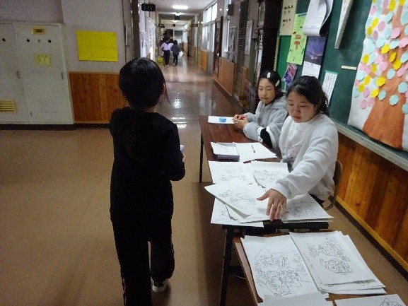 答え合わせに大忙し。お好きな塗り絵をどうぞ。みんながよろこぶ塗り絵ってどんなのかな。アンケートを採って作った景品でした。