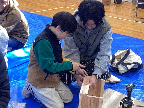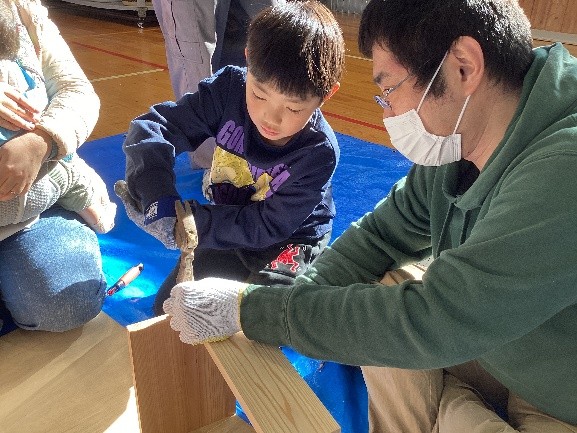 親子で力を合わせて、トンカチで釘を打ち、組み立てていきます。