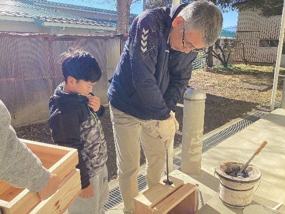 完成したら自分の好きなところに「手良小学校」の焼き印を押してもらいます。押すのは校長先生です。