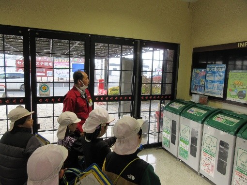 店長の冨島さんが開店前の店内を案内してくれました。お客さんが出しやすいようにリサイクルボックスを店先に設置。生産やコーナーは近くの農家さんが直接持ってきている。お刺身コーナーの社員さんは朝の5時から仕事している。お総菜コーナーは売り上げが伸びている。など、いろいろと説明してくれました。