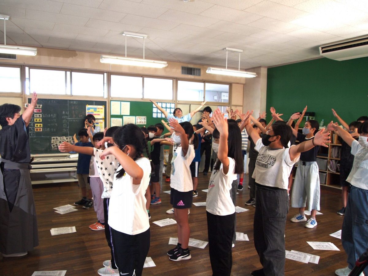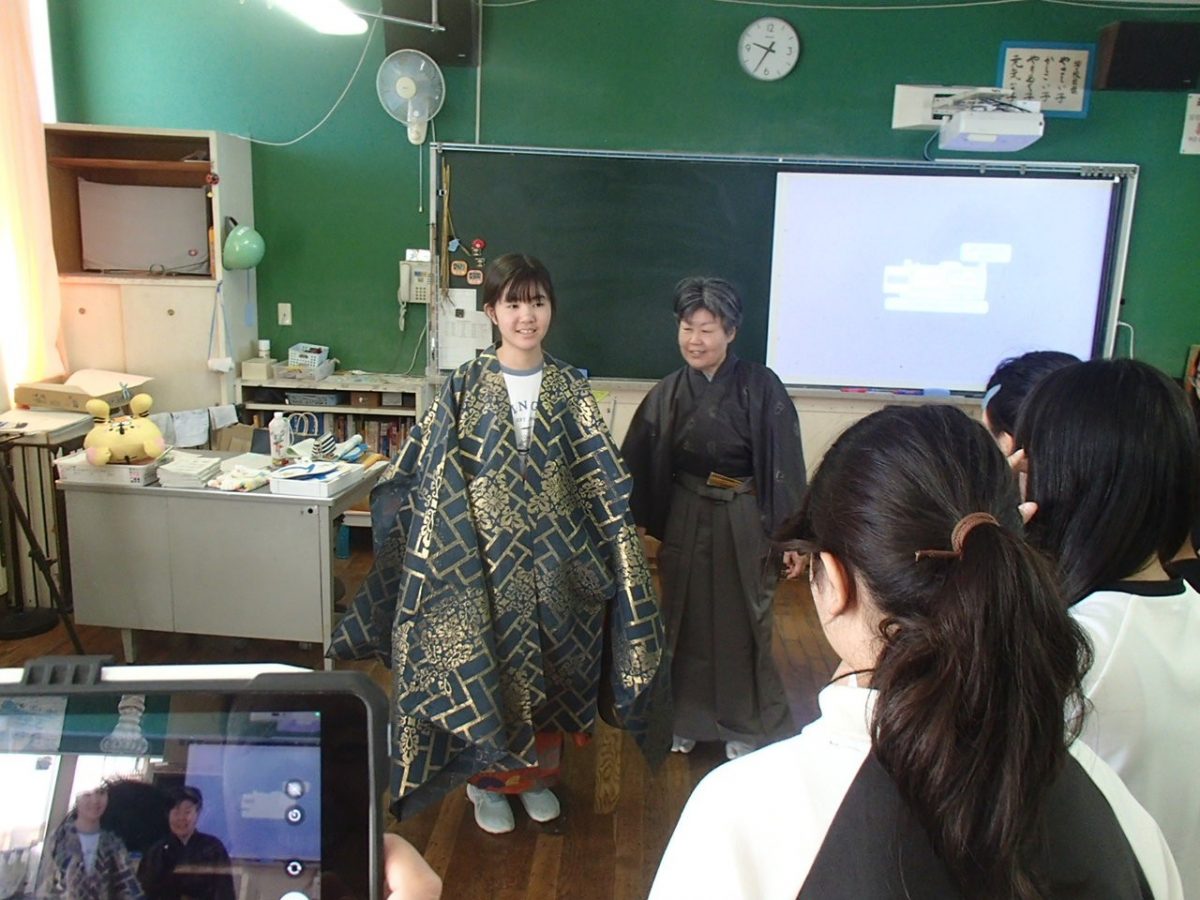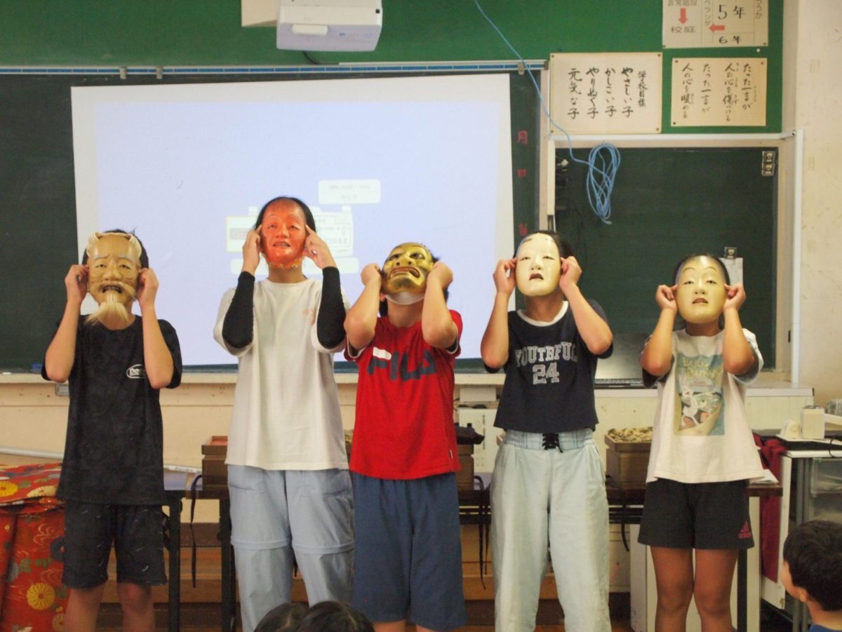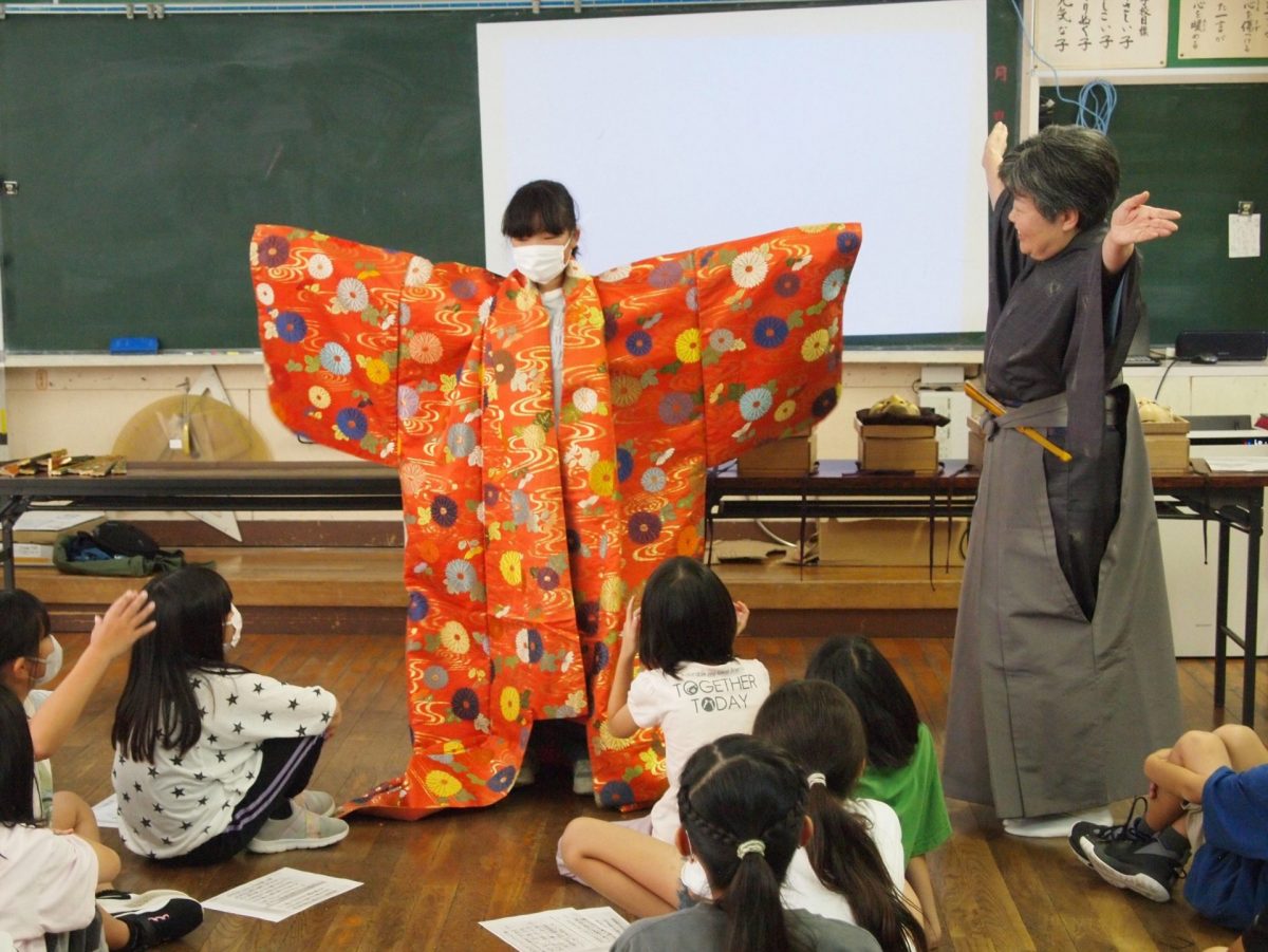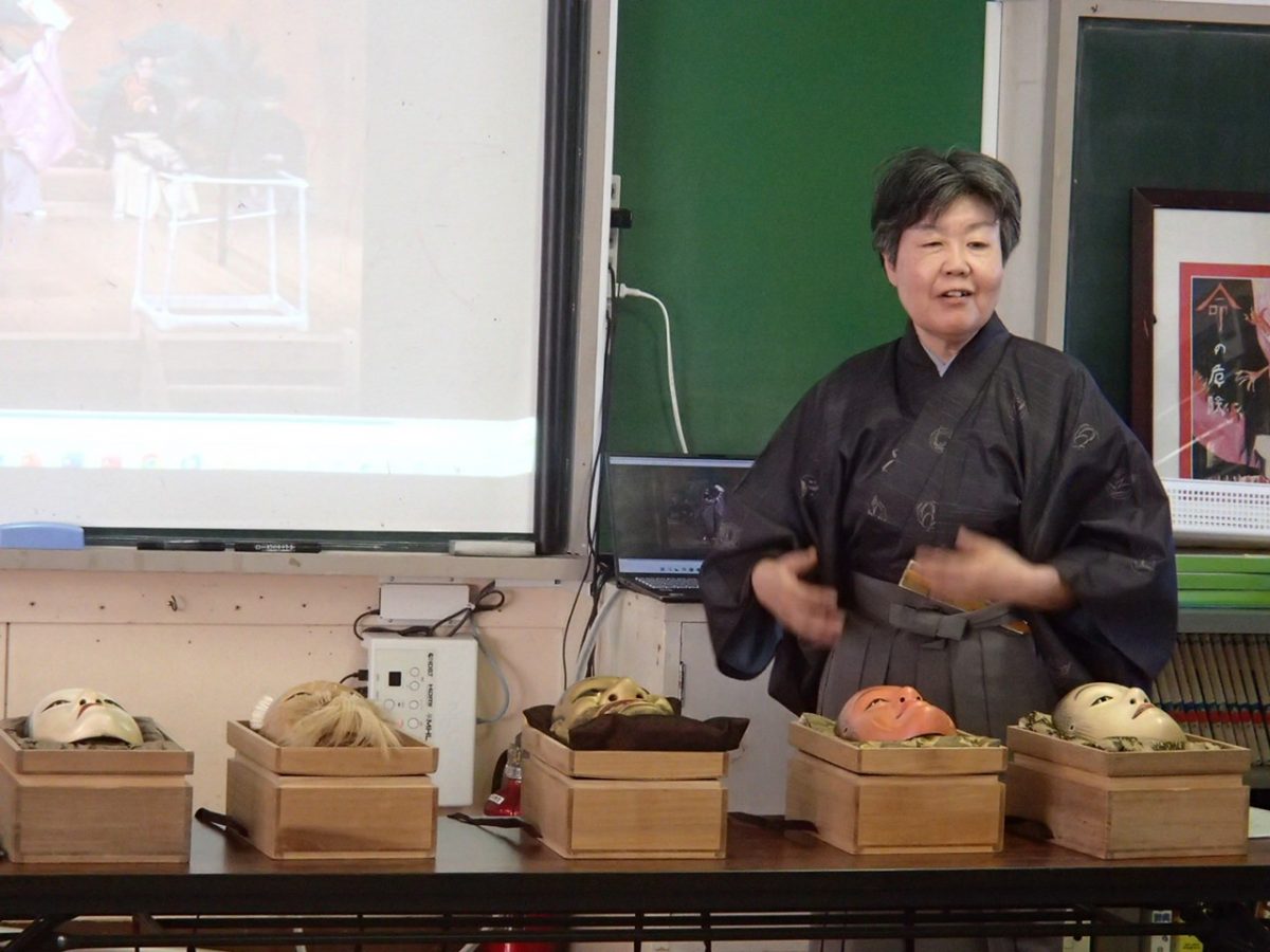 4・5・6年生が能楽体験をしました。シテ方観世流能楽師 中家美千代先生(なんと、本校の子どもと親の相談員宮下真由美先生の妹さん!)が来校し、能楽解説、謡・仕舞の体験、能面・装束体験などをしました。