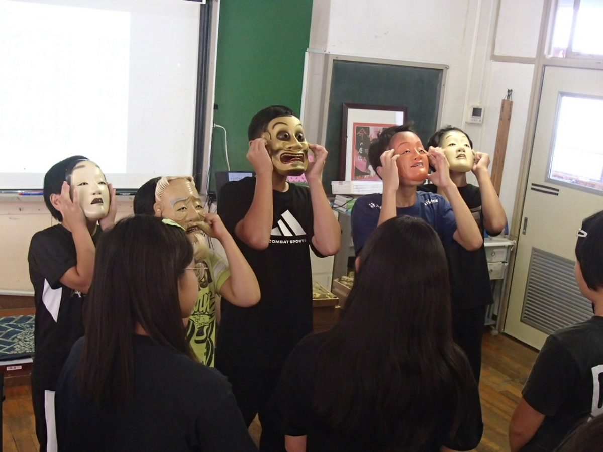 能面(面=おもて)を持って顔に当ててみる体験もしました。面をつけると視界がとても狭くて周りが見えないそうです。少しうつむくと悲しい表情、上を向くと嬉しい表情に見えるので、とても不思議です。