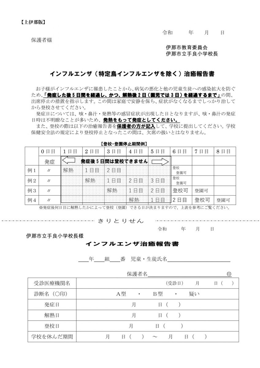 インフルエンザ治癒報告書(ダウンロード⇒プリント⇒保護者が記入します)