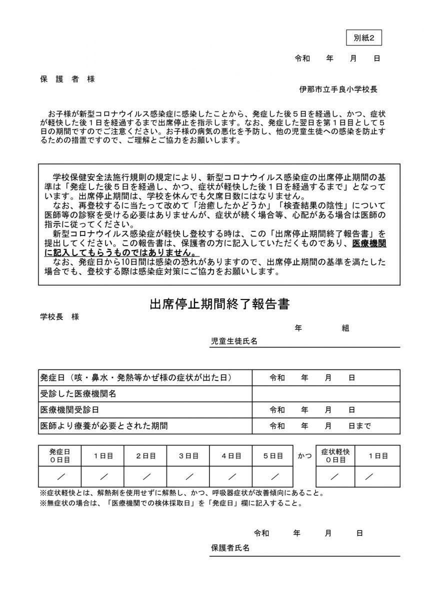 コロナウィルス出席停止期間終了証明書(ダウンロード⇒プリント⇒保護者が記入します)