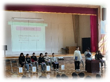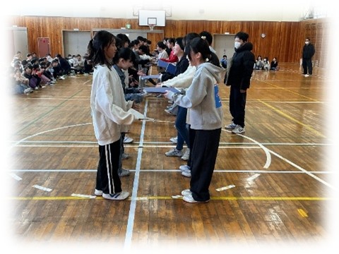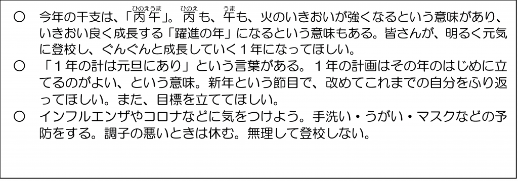 学期末にはインフルエンザ等の感染拡大によって学年・学級閉鎖が出てしまう状況でしたので、明日からの冬休みでは、まずはしっかりと体調を整えて下さい。そして、地域の行事に参加したり家族の一員として過ごしたりといった、年末年始にしかできない時間を過ごしながら心身ともに充実させ、3学期、元気に登校してほしいと思います。